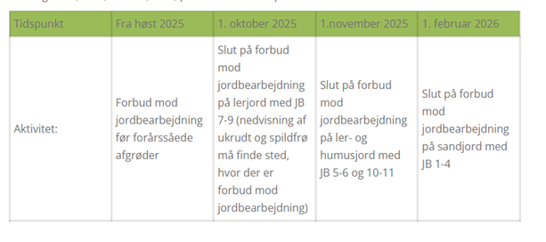 Hvis der i 2026 er planlagt vårsæd på din mark, skal du på den mark udskyde pløjning, harvning og anden jordbearbejdning fra høst 2025 til senere på året eller det følgende år afhængig af jordtypen, fordi vi har krav om jorddække i denne periode. Der stilles ikke krav til typen af jorddække, som kan opfylde kravet.